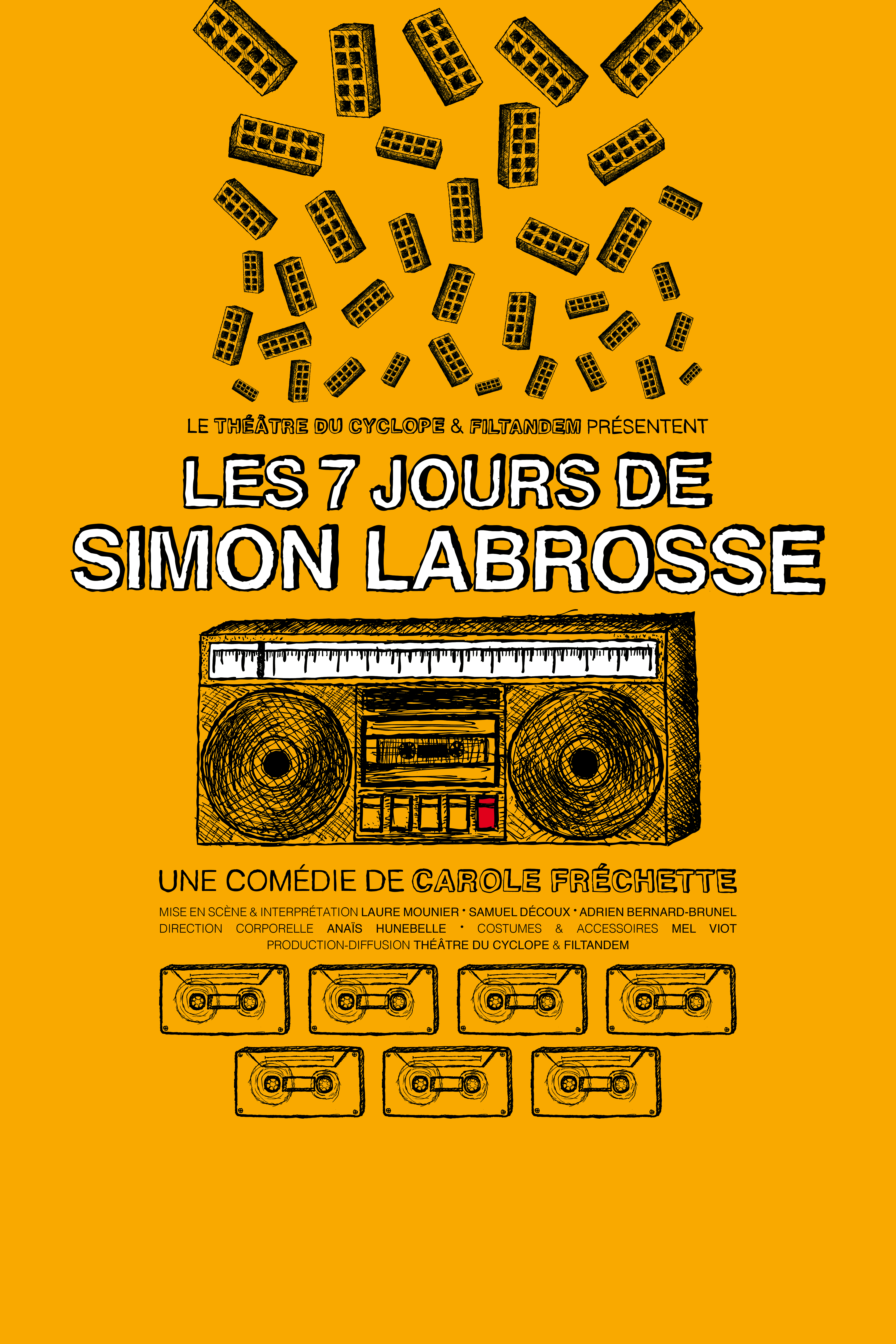 Les 7 jours de Simon Labrosse est une pièce écrite par Carole Fréchette et mise en scène et interprétée par Laure Mounier, Samuel Découx et Adrien Bernard-Brunel. Ce spectacle est joué au Théâtre du Cyclope les 8 et 9 octobre 2021 à 21h, le 10 octobre à 17h ainsi que le 31 décembre à 18h30 et à 20h30.