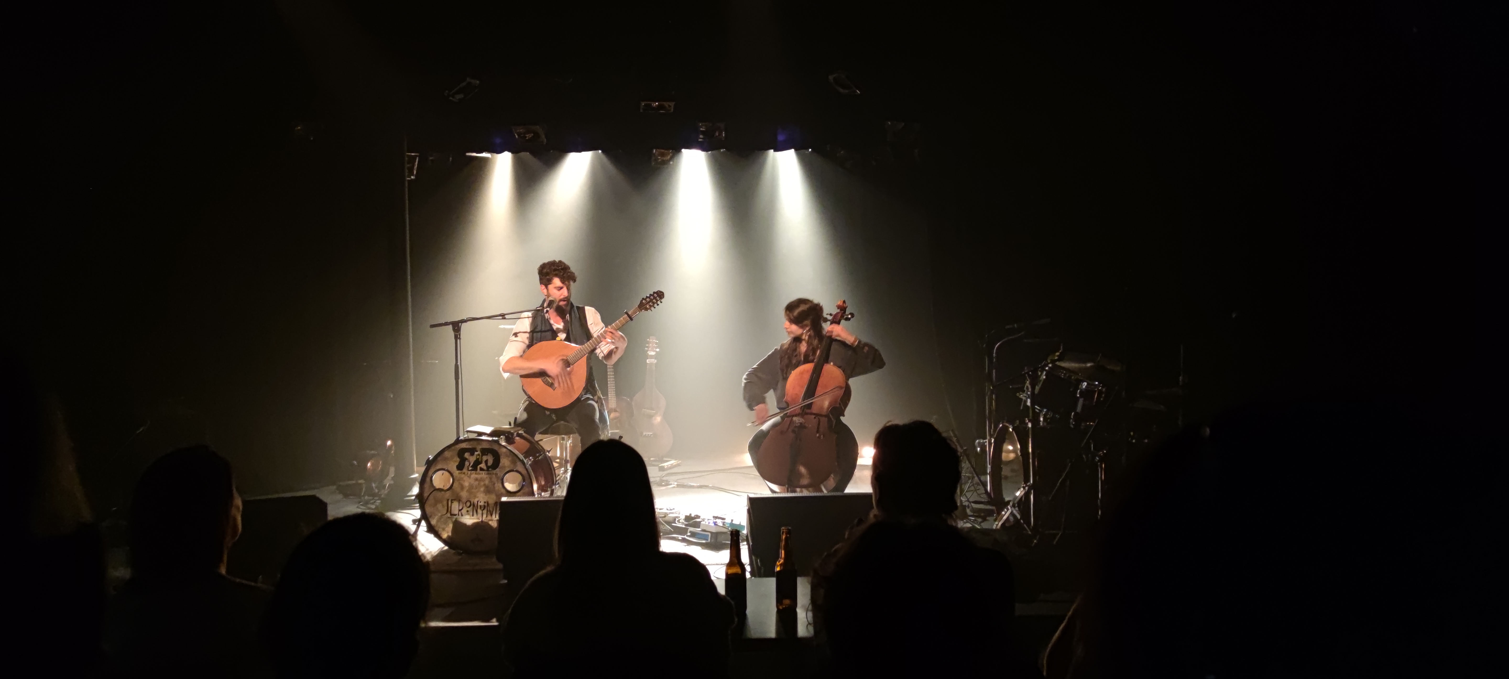 Le deuxième artiste programmé lors de cette soirée se nomme Jeronÿmus. J’ai été subjuguée par la puissance et la tessiture de sa voix que j’ai adorée. Ce chanteur – qui chante d’ailleurs en trois langues différentes – est aussi musicien puisqu’il s’est également chargé de son accompagnement avec un instrument à cordes appelé bouzouki irlandais ainsi qu’une grosse caisse.