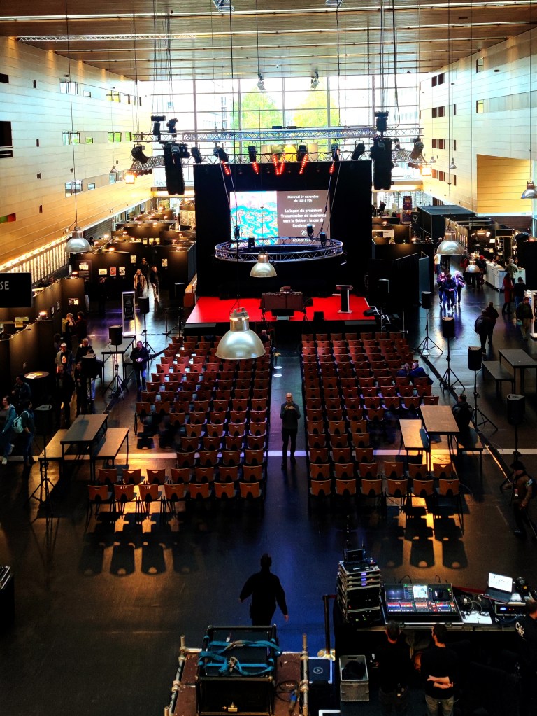 Après cet interlude musical, je suis allée faire un rapide petit tour des expositions avant de m’installer, tout comme l’ensemble de la cité des congrès semble-t-il, pour le discours inaugural, précédant la leçon du président. Le discours inaugural était l’occasion de remercier les partenaires, mais également de présenter les nouveautés comme les séries audio et le nouveau partenaire qu’est la société française de physique.