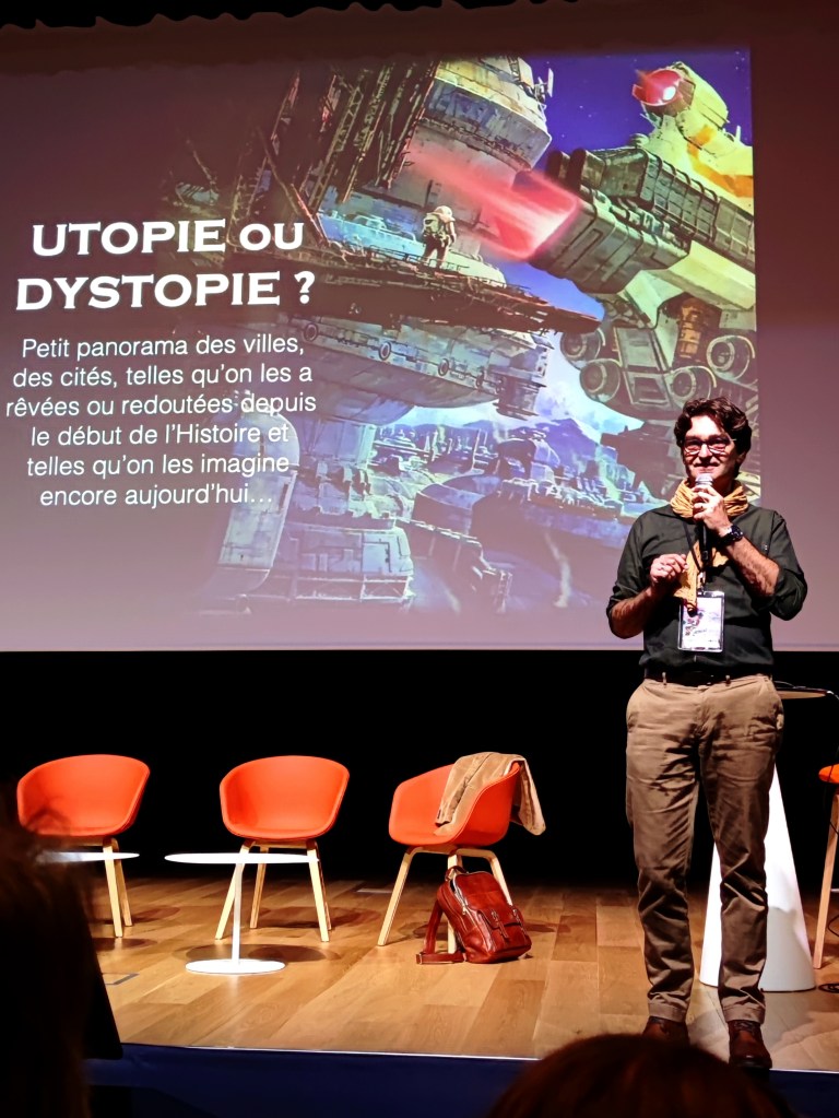 Direction ensuite le CIC pour moi pour assister à une conférence à destination du jeune public – mais pas que – intitulée Utopie ou dystopie ? dans le cadre de l’école du professeur Zutop. Cette conférence était assurée par Ugo Bellagamba, qui nous a fait un retour historique sur ces deux termes, nous a donné des exemples pour illustrer ses propos et nous a fait voyager de l’Antiquité à nos jours. La conférence était passionnante !